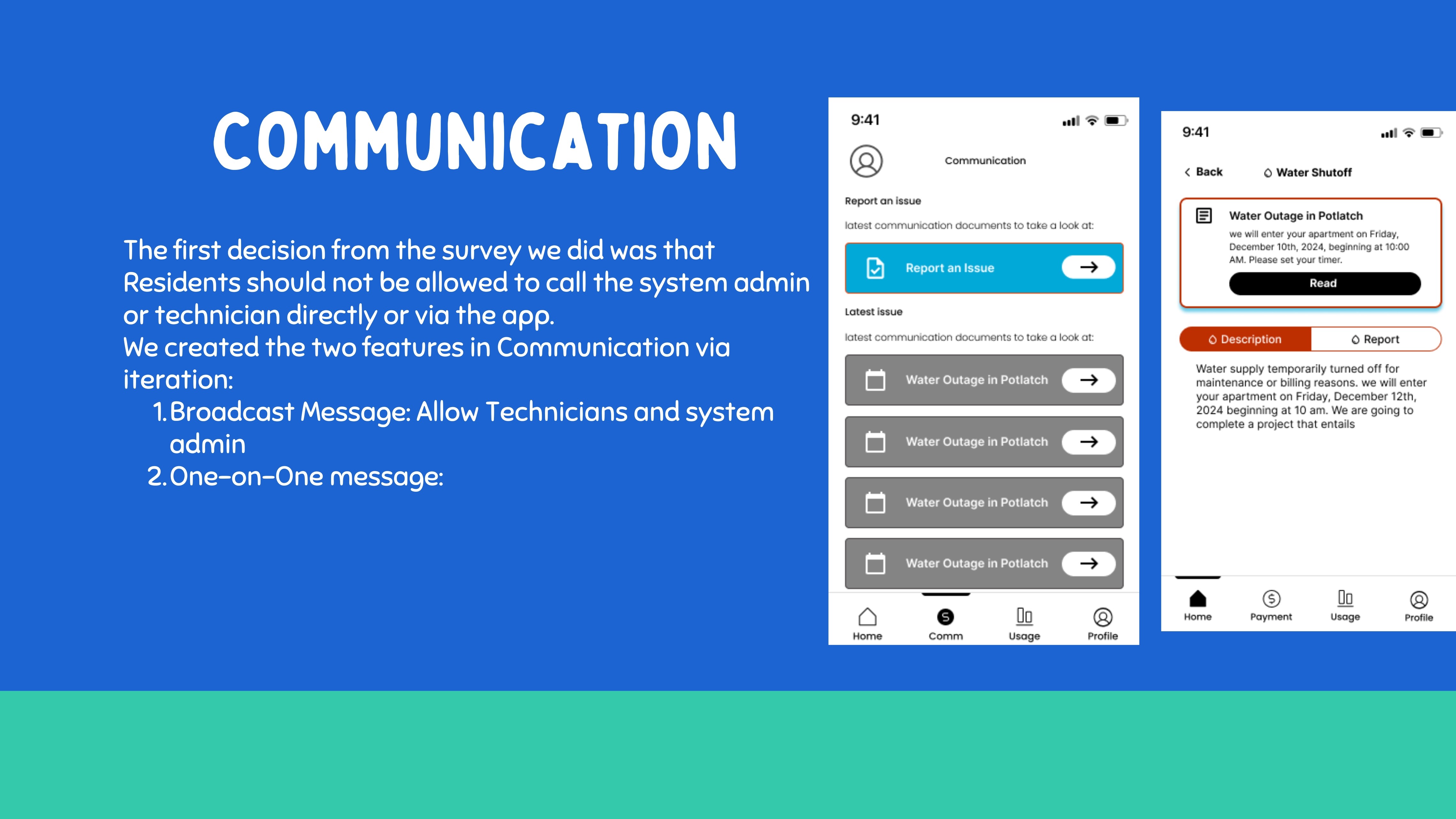 The ability to report issues to technicians and receive issues from residents